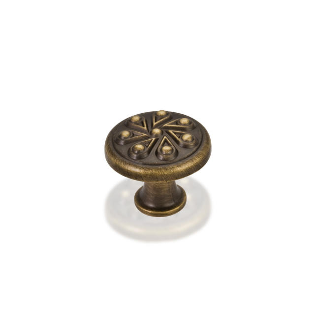 1-3/16" Diameter Zinc Die Cast Cabinet Knob with teardrop detail. Packaged with one 8/32" X 1-1/8" screw. U.S. Patent D570,183